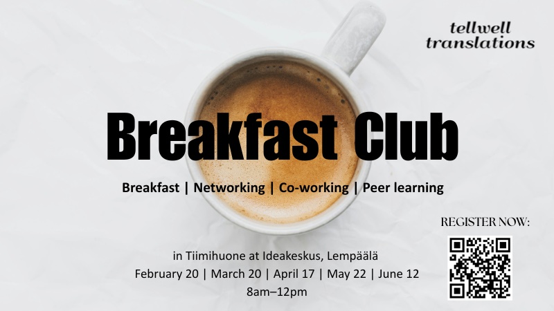 Breakfast Club sai alkunsa TellWell Translationsin kansainvälisen tiimin kuukausittaisista etäkahveista, joita on järjestetty parin vuoden ajan. Live-aamiaisten myötä ja avaamalla osallistumisen myös muille yrittäjille/asiantuntijoille monipuolistamme kohtaamisia ja luomme kiinnostavia uusia mahdollisuuksia vertaisoppimiselle. Olet lämpimästi tervetullut Breakfast Clubiin läheltä tai kauempaa! (Etäosallistuminen on toistaiseksi tarjolla vain tiimietuna TellWell Translationsin tiimin jäsenille.)